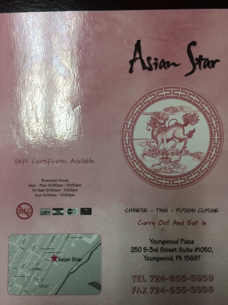 Welcome to Asian Star of Youngwood, where the vibrant flavors of Asian fusion meet quality service in a cozy setting. Located at 250 S 3rd St, this gem specializes in a delightful mix of Thai and Szechuan cuisine, providing a culinary journey that is sure to satisfy your palate.