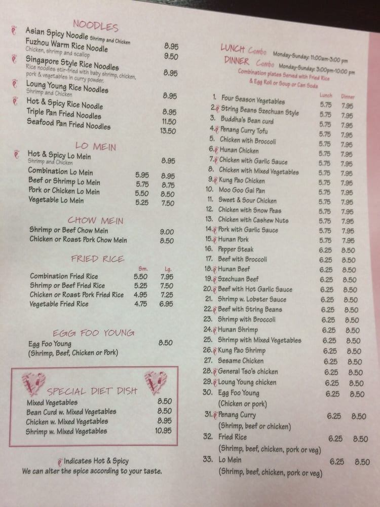 The menu showcases a variety of tantalizing dishes, including the Teriyaki Chicken and Kung Pao Beef, perfect for those seeking bold flavors. Don’t miss the Egg Foo Young options, available in chicken, pork, or shrimp, offering delicious value for every taste. Additionally, soups like Tom Yum and Hot Sour provide a comforting touch to any meal.